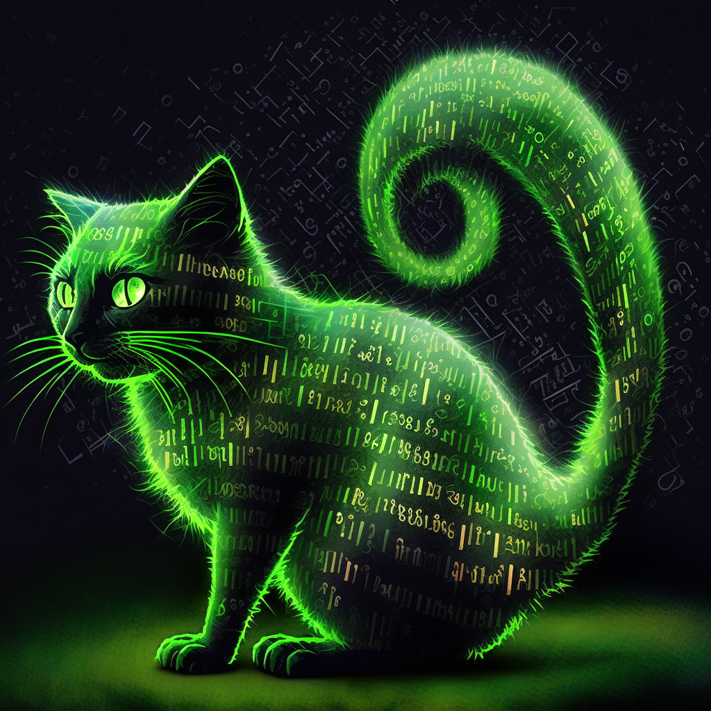 swirling glowing green error messages inside cat silhouette